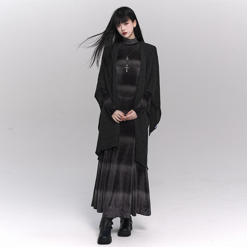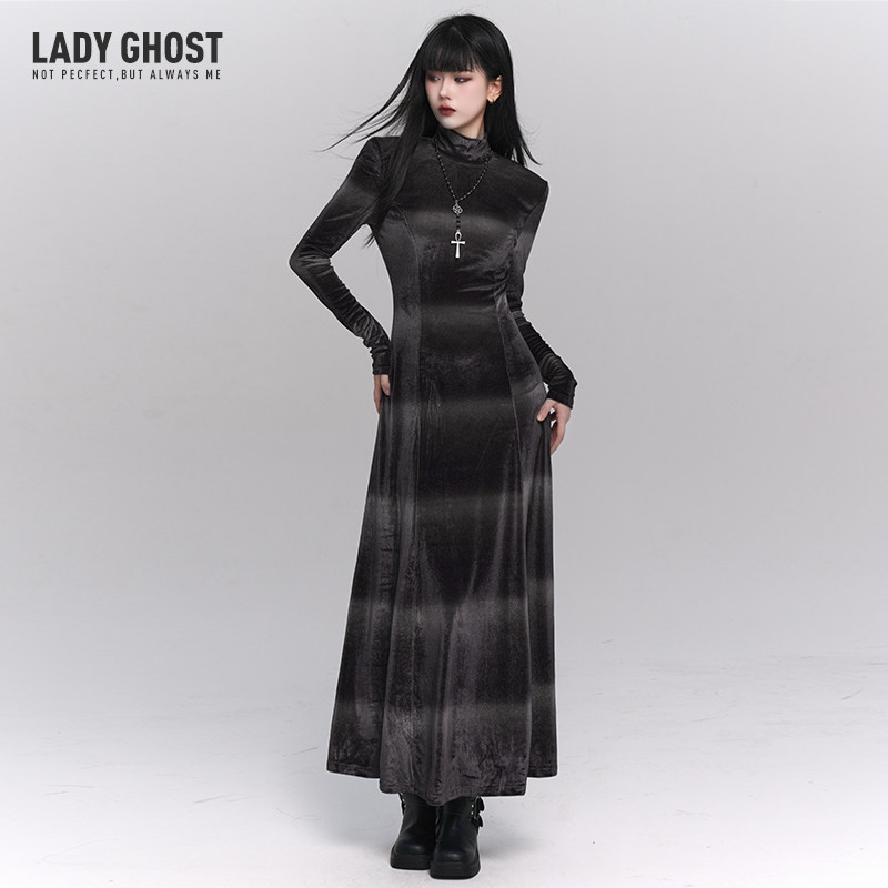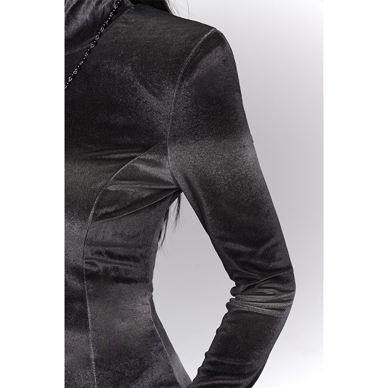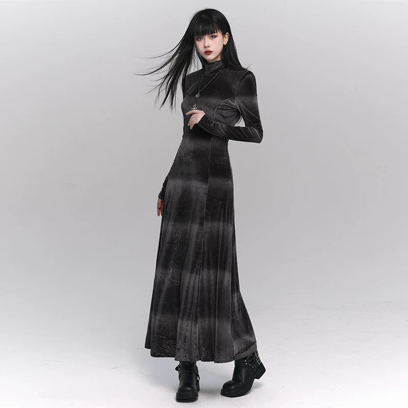 This gray velvet midi dress combines a soft texture with a structured silhouette, creating a refined and elegant look. The long sleeve design and mid-length cut make it ideal for fall and winter styling.